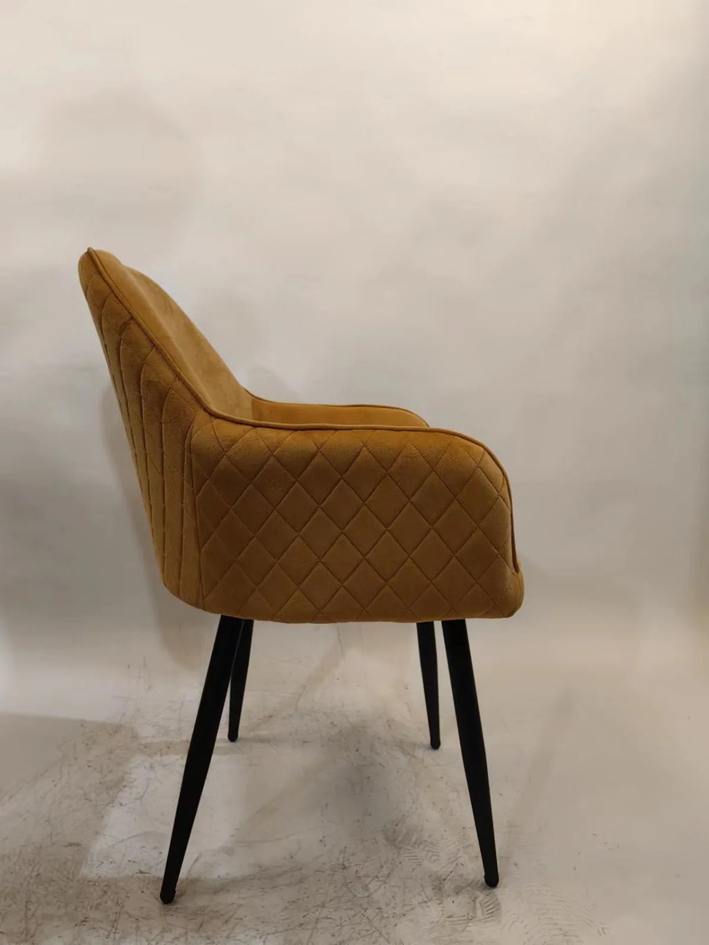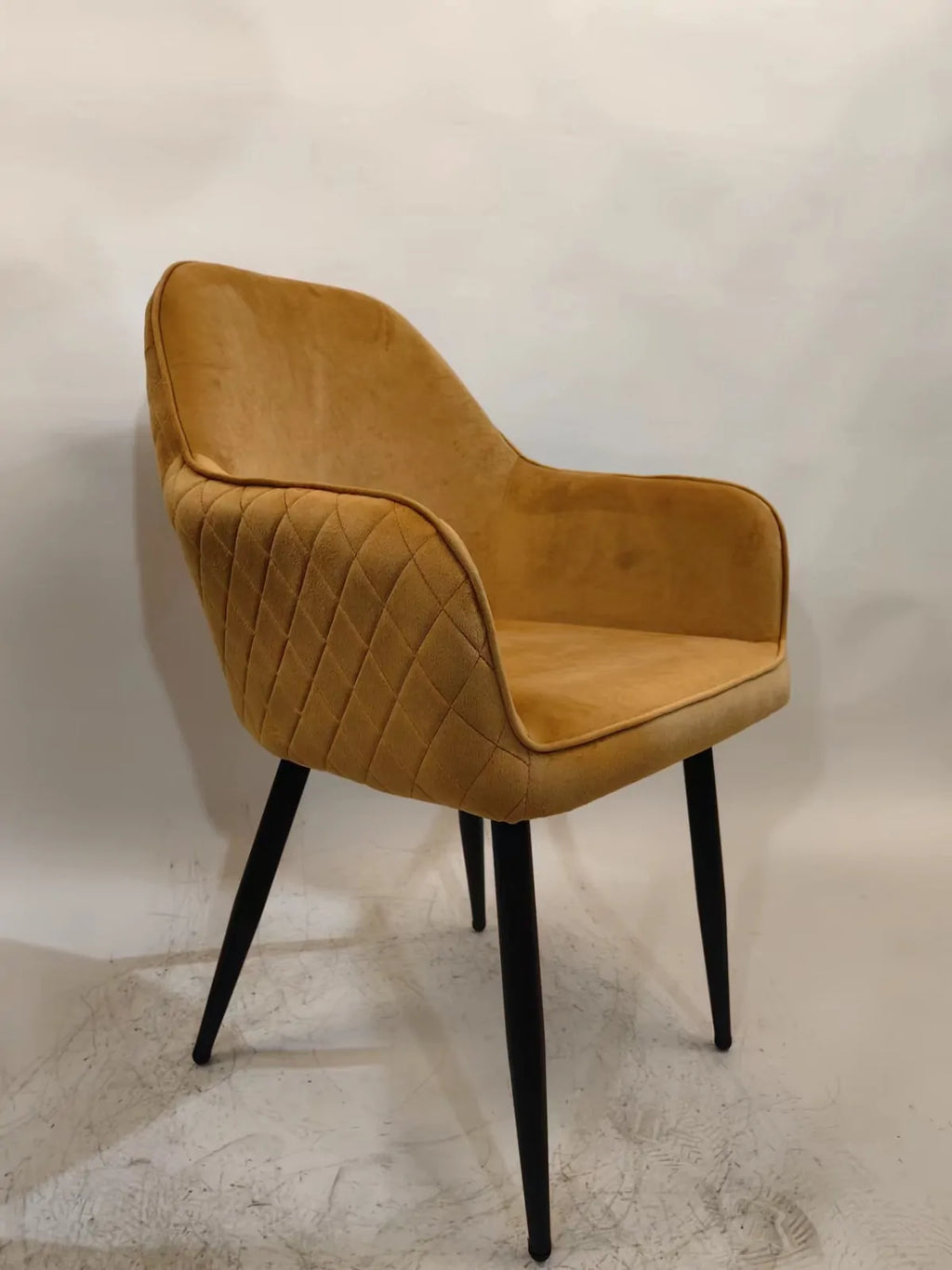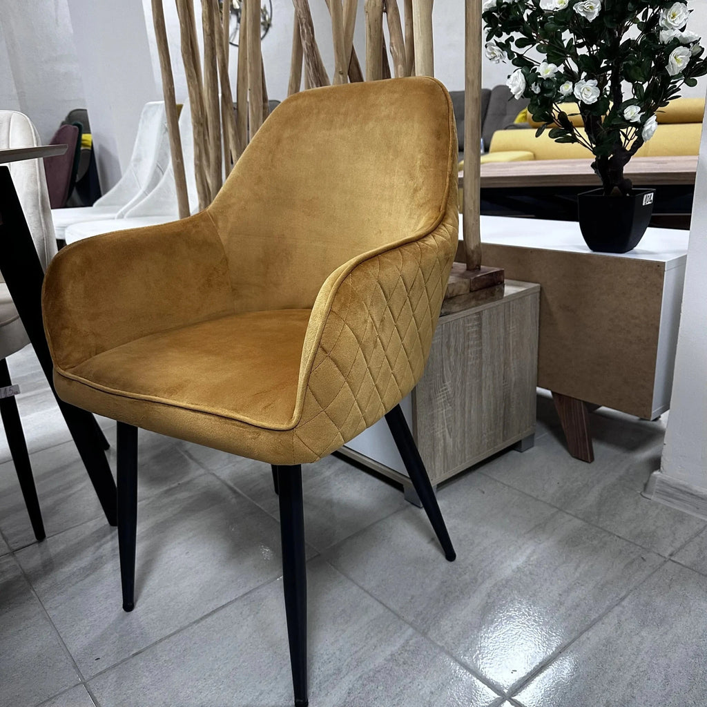 Трапезният стол Алба е перфектното решение за вашата трапезария, кухня или дневна. Изработен с висококачествена кадифена тапицерия в цвят старо злато и метални крака в черен цвят, този стол съчетава луксозен вид, комфорт и модерен дизайн.