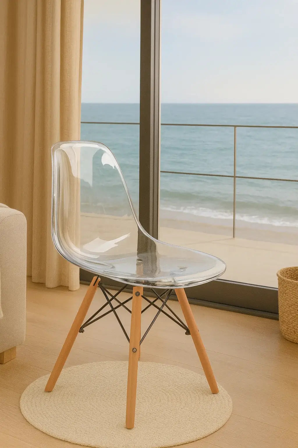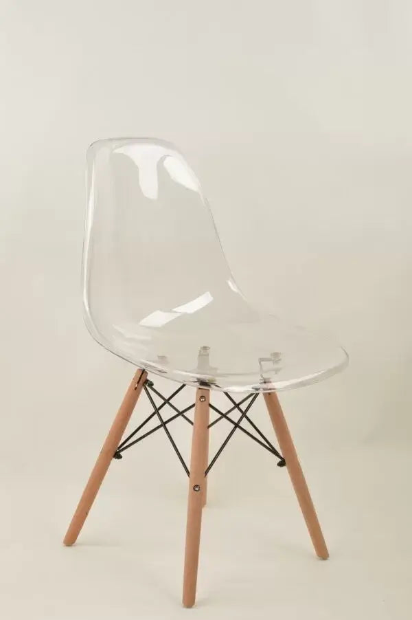 Този емблематичен стол с прозрачна кристална седалка и бели дървени крака е истинска модерна седалка от средата на века. Перфектното съчетание на прозрачност и чистота за вашия дом.