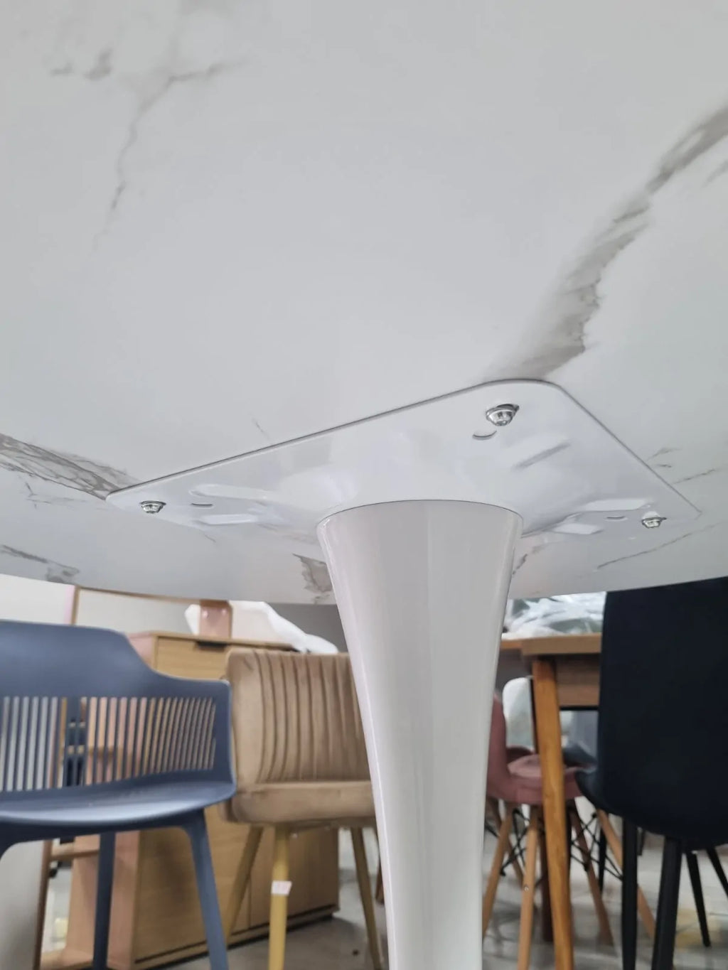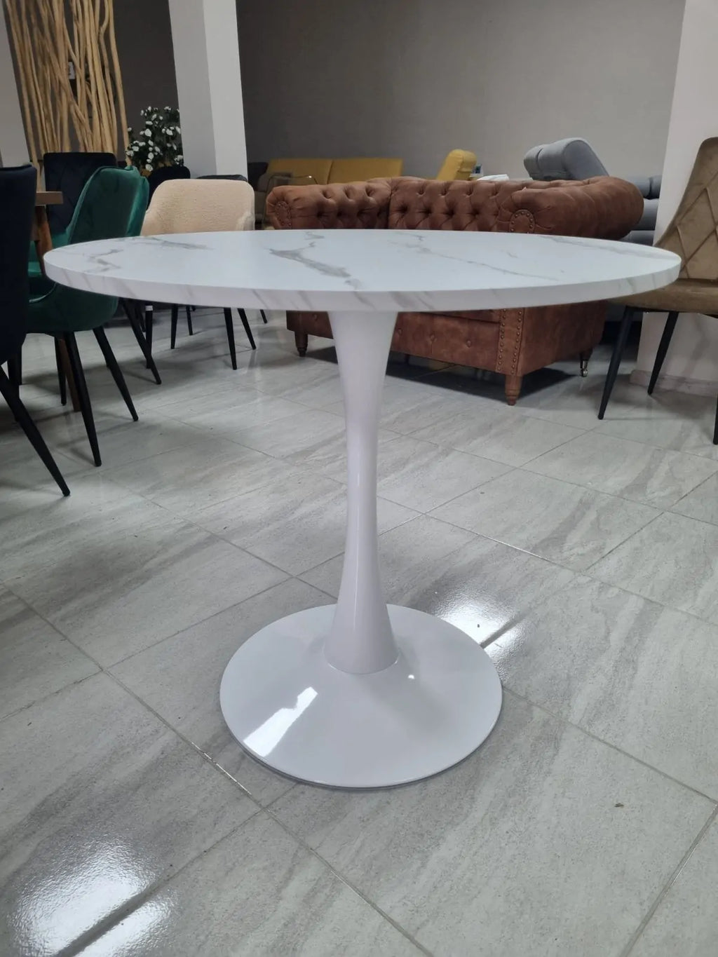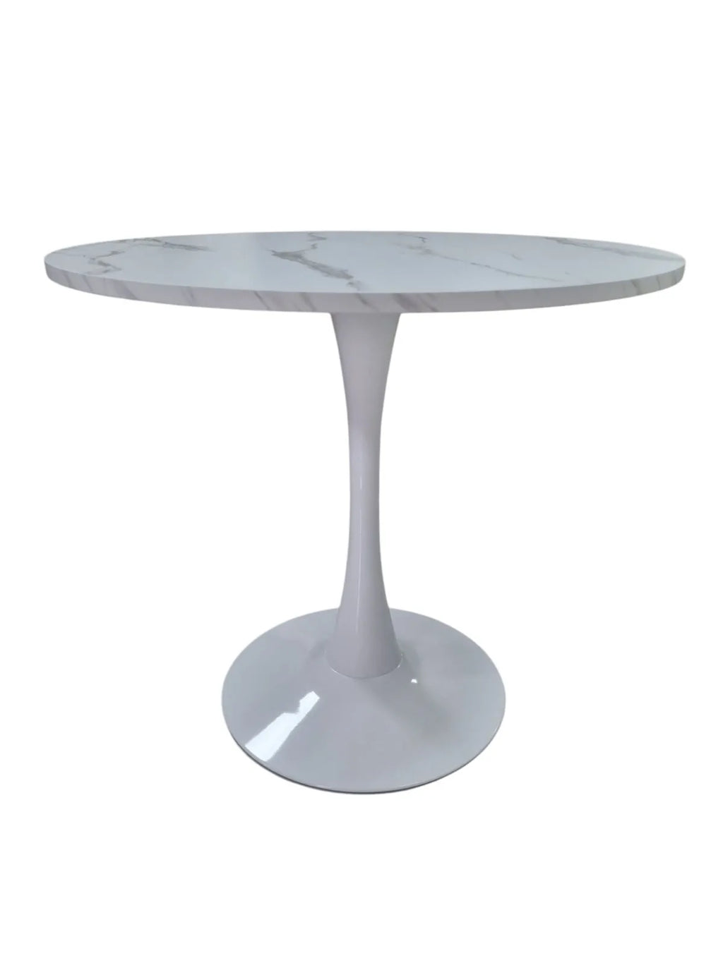Трапезната маса Мери е перфектното решение за вашата трапезария, кухня или дневна. С кръгъл плот от МДФ в чист бял цвят и стилна метална основа тип лале, тази маса съчетава модерен дизайн, стабилност и практичност.